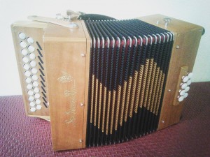 音楽練習室に新しいお友達がきてくれました。 蛇腹の押し引きで出てくる音が異なるダイアトニック式のボタンアコーディオンです。