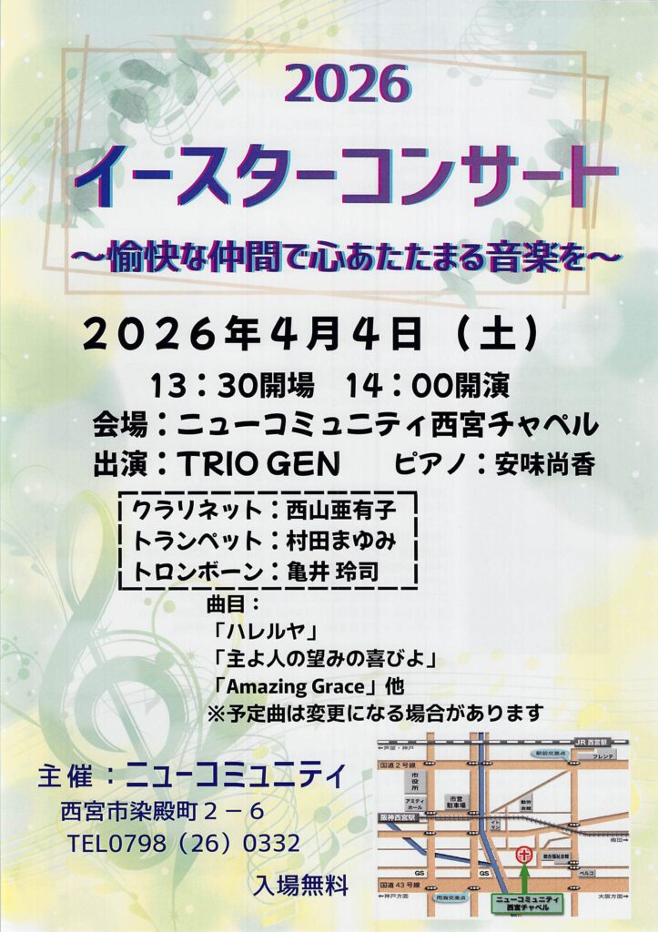 【演奏会情報】4月4日(日) イースターコンサート @ニューコミュニティ西宮チャペル