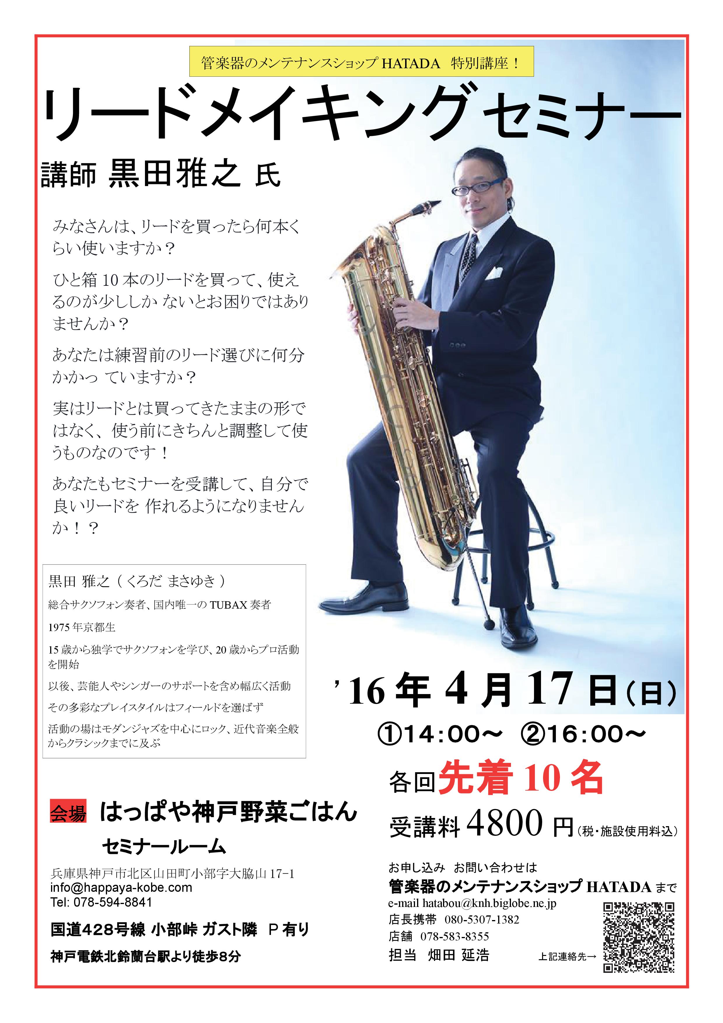 サックス奏者の黒田雅之氏によるリードメイキングセミナーが開催されます。使えるリードを自分で作れるようになるリードの調整法を教えてもらえます。シングルリードの調整ですので、サックスだけでなくクラリネットもOK。